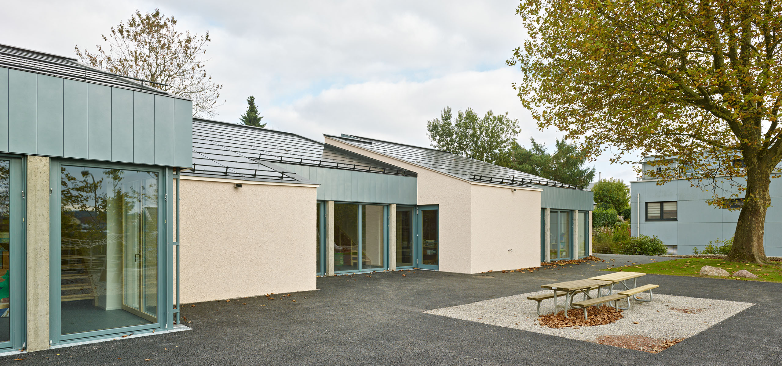 Der Neubau für die zwei Kindertagesstätten und die drei Kindergärten mit Büros für die Schulverwaltung passt sich präzise in das Grundstück ein und bietet eine optimale Orientierung und Besonnung der Räume.