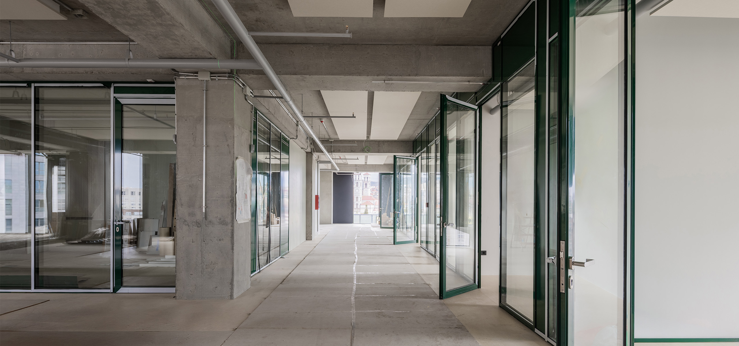 Das neue freistehende Büro- und Fabrikationsgebäude in Turgi bei Baden bildet in einem städtebaulich heterogenen Umfeld mit seiner Sockelzone und den Nebenbauten eine klar definierte Nachbarschaft.