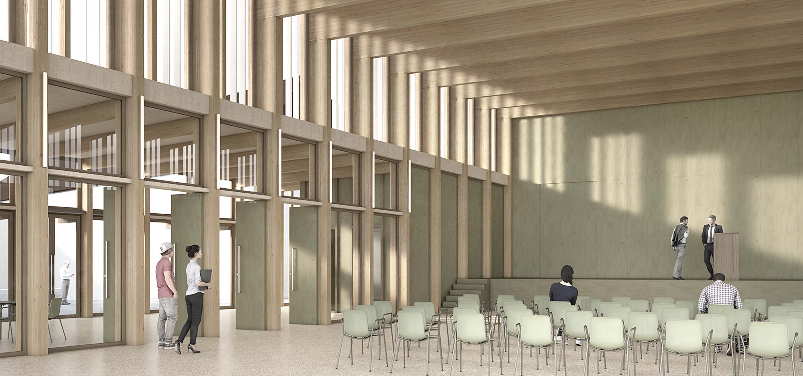 Wie ein feingestaltetes Schmuckstück präsentiert sich die neue Dreifachturnhalle mit Aula im Zentrum der Schulanlage. Die gegliederte Form mit ihrer gefalteten Dachkonstruktion ermöglicht je nach Standpunkt unterschiedliche Lesbarkeiten und vermittelt zwischen Schulhaus und der restlichen Schulanlage.