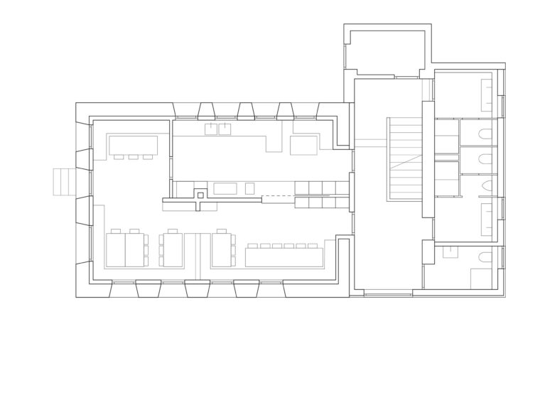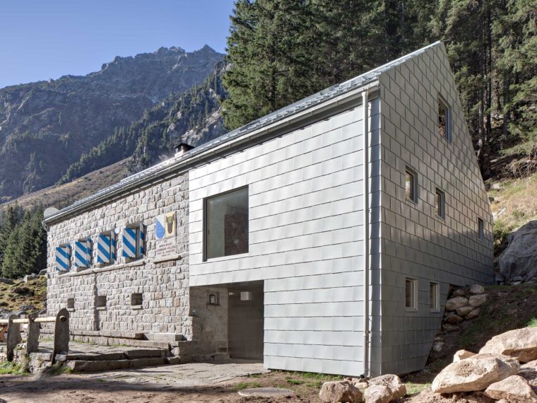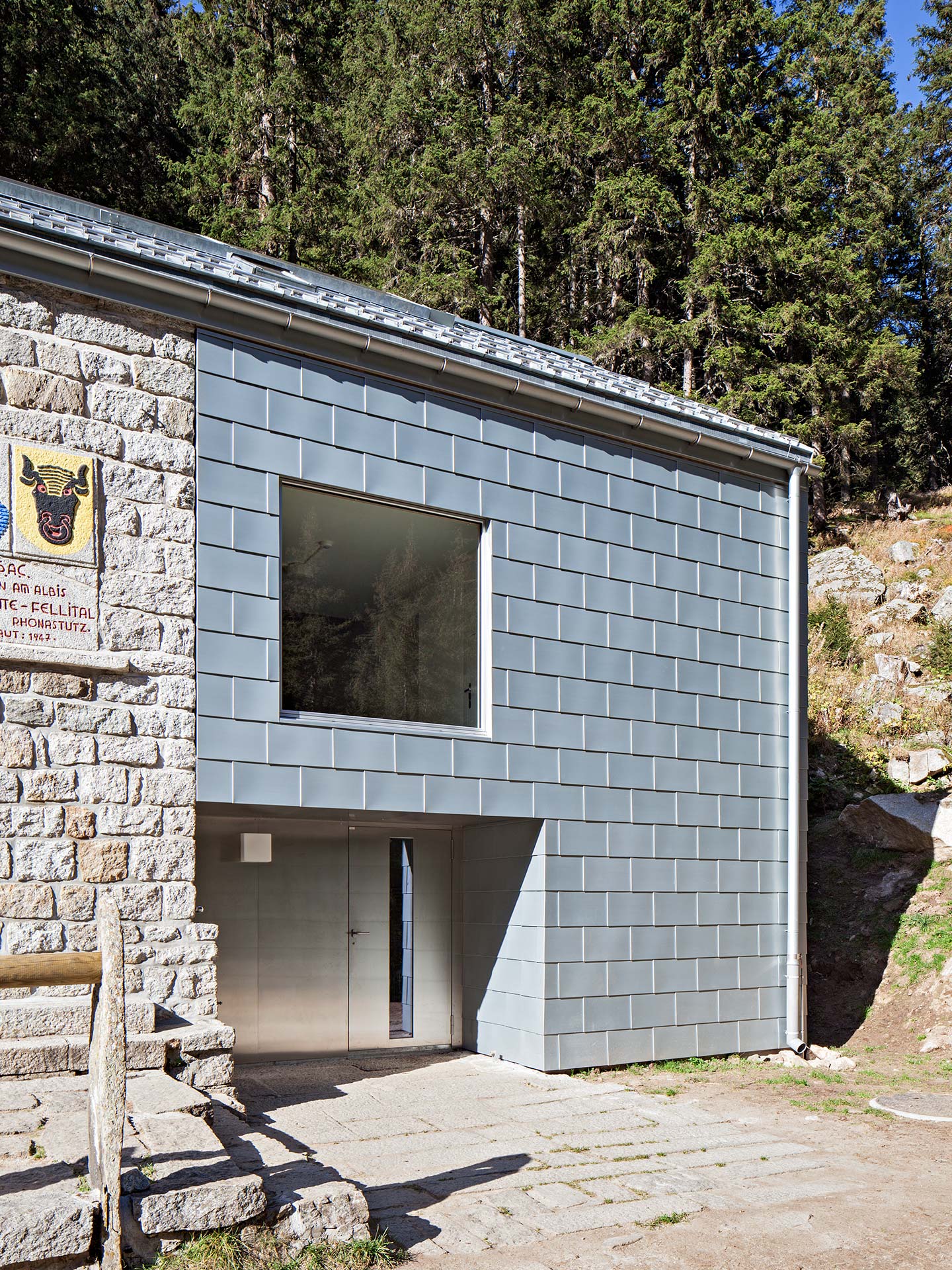Die Verkleidung der Holzkonstruktion mit Rheinzink-Metallplatten bietet einen optimalen Witterungsschutz und nimmt die Struktur des Bruchsteinmauerwerkes auf. Zusammen mit dem neuen Blechdach erscheint das Gebäude als neues Ganzes.