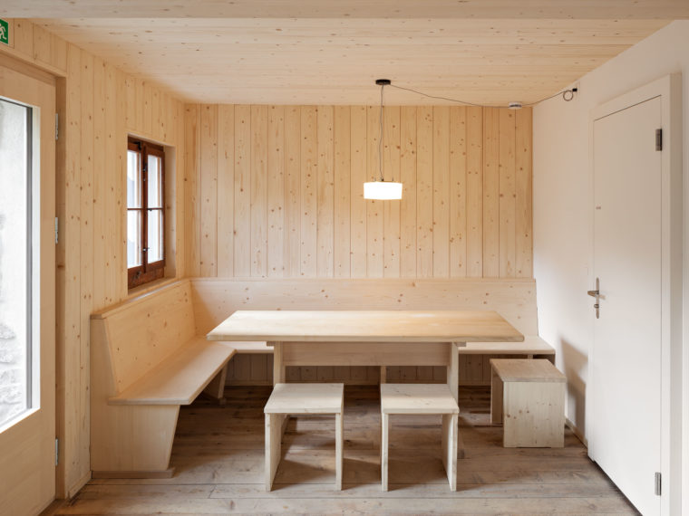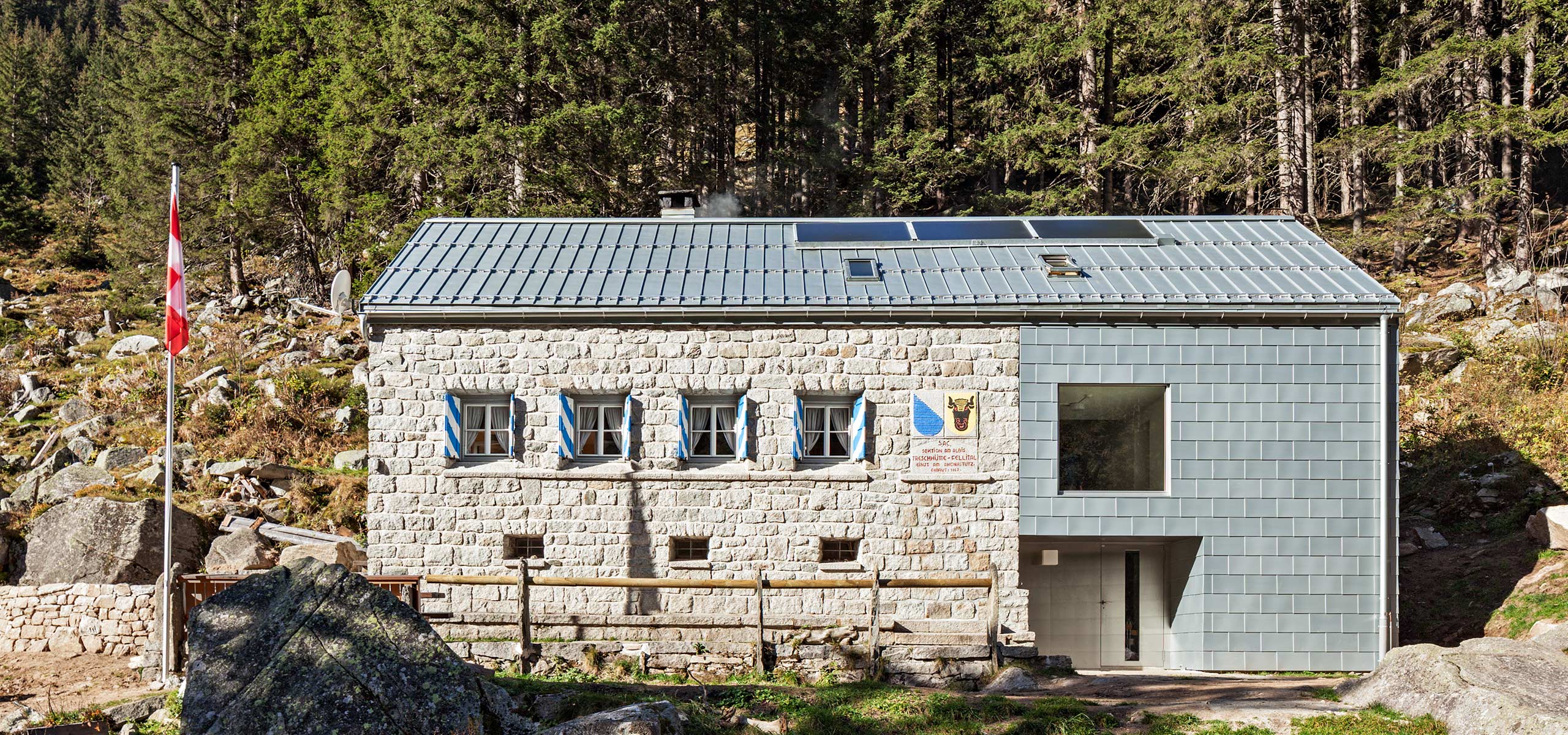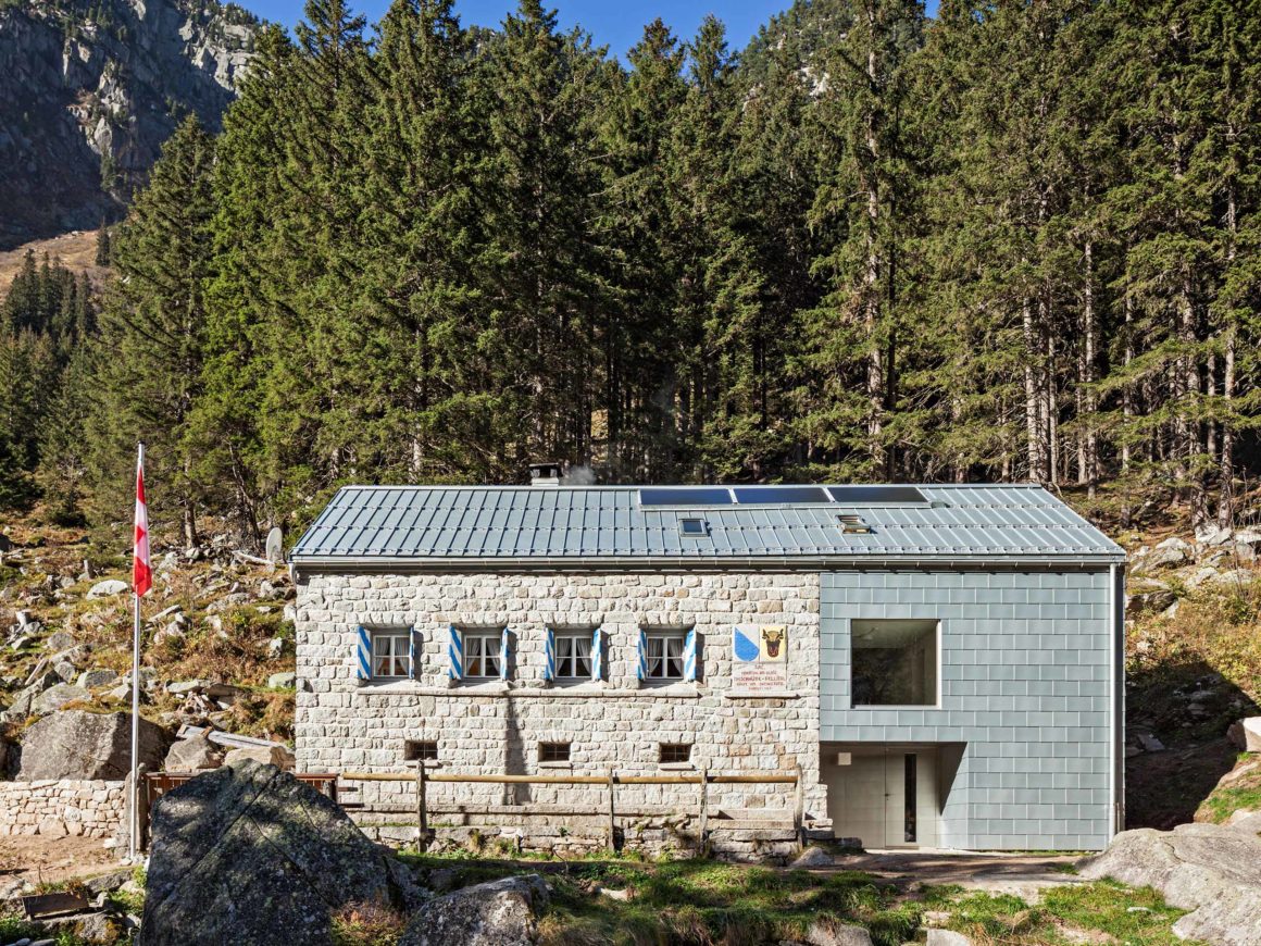Der in vorfabrizierter Holzbauweise ausgeführte Anbau erweitert die bestehende Hütte auf eine einfache und selbstverständliche Weise.