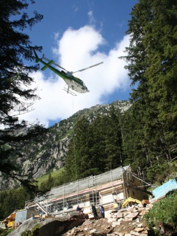 Innerhalb von fünf Monaten wurden mittels Heli- Rotationen unzählige Tonnen Material ins Fellital geflogen und die Bauleitung hatte zeitweilig bis zu 15 Arbeiter auf der engen Baustelle zu koordinieren. Die grösste Herausforderung war dabei das im Frühsommer unsichere Wetter, da die Betonierarbeiten und die Holzbaumontage direkt auf der Baustelle erfolgten.